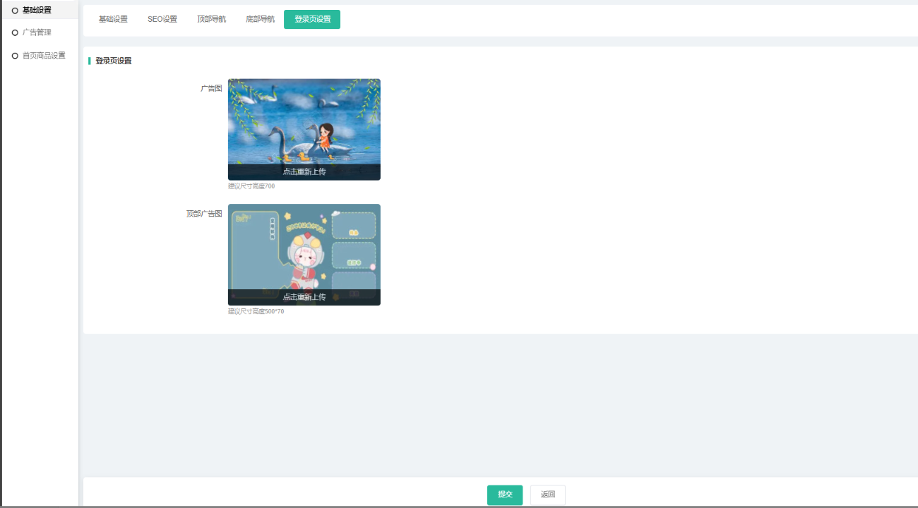 首页设置:设置PC端logo(建议尺寸480 * 70)、幻灯片样式一背景(建议高度400)