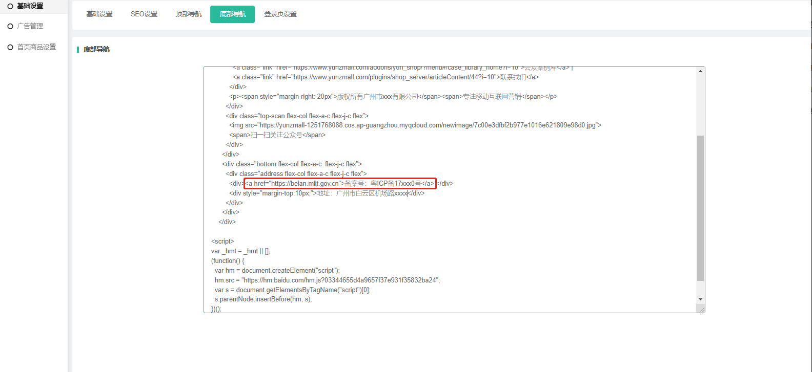 可自定义设置底部导航logo、二维码、导航链接、备案号、公司信息等;