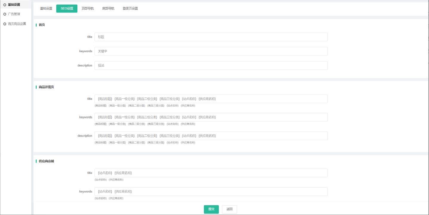 支持设置首页、商品详情页、供应商店铺页面title、keywords、description,支持多种变量自动调用;