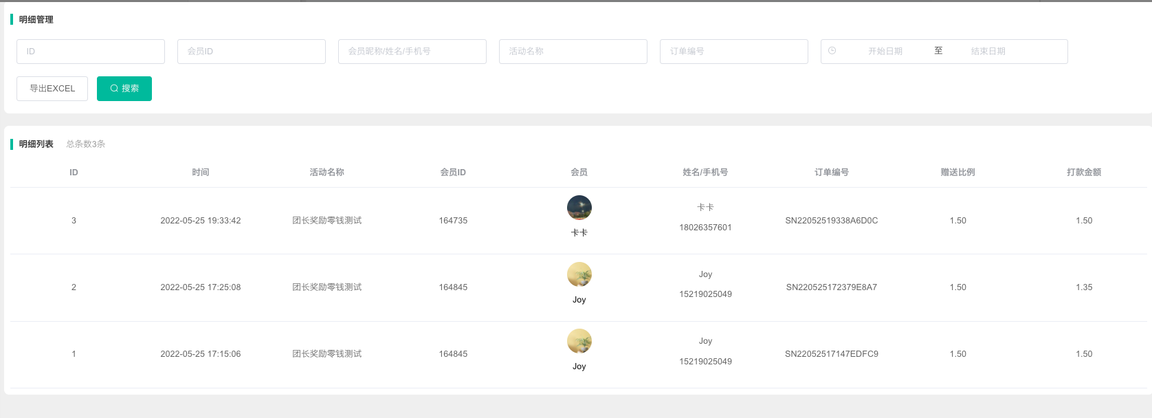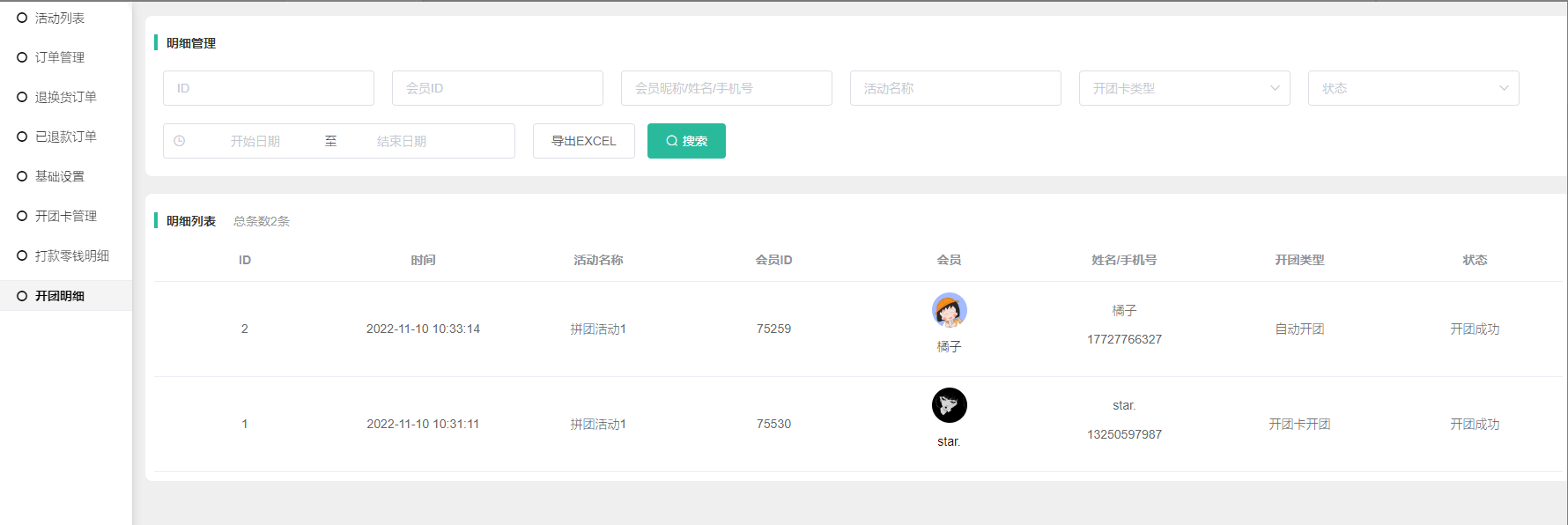 1, 参团会员成团自动开团、开团卡开团的明细