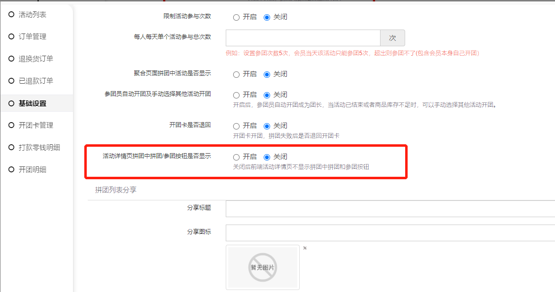 6, 活动详情页拼团中拼团/参团按钮是否显示:关闭后前端活动详情页不显示拼团中拼团和参团按钮