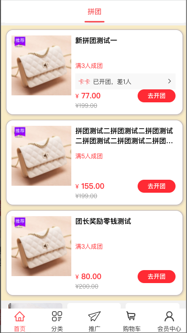 1, 在拼团活动聚合页可查看到已开始、未结束的拼团活动,在此列表可查看到拼团活动名称、拼团最低金额,拼团最低金额所需人数,拼团中拼团(后台基础设置需要开启),点击去开团跳转到拼团活动详情页