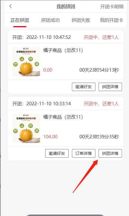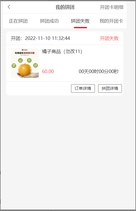 2, 正在拼团:还未拼成功的团,状态处团长显示开团中,拼团会员显示拼团中,开团卡开的团没有订单详情按钮