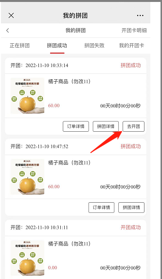 4, 开团卡开团,开团成功后跳转到我的拼团页面