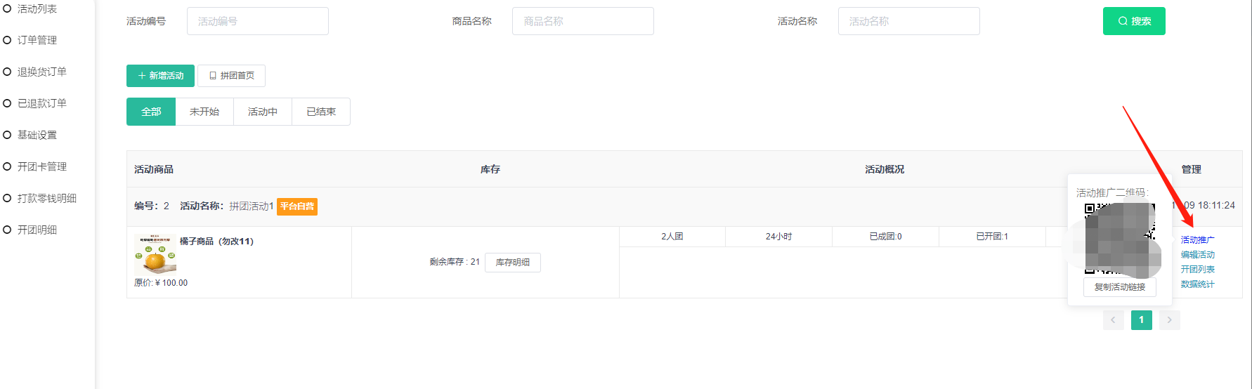 2, 活动概况:已开团数量和已成团数量,可手动结束拼团
