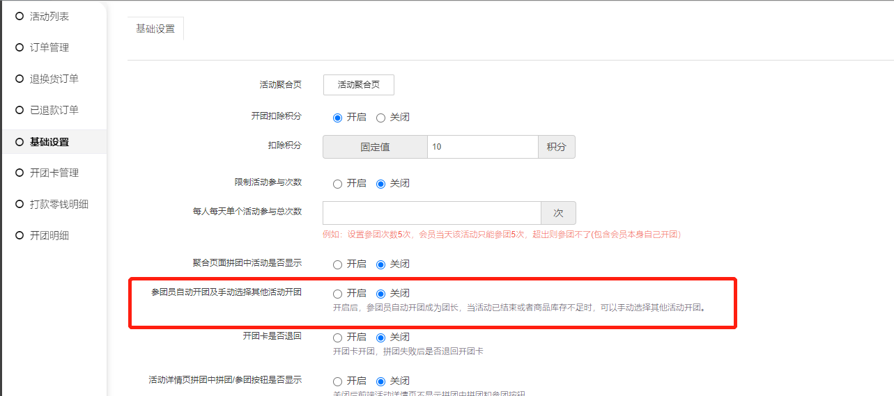 11) 经销商限制开团:开启后只有经销商才能开团,普通会员不能开团;自动开团、开团卡开团会受此限制