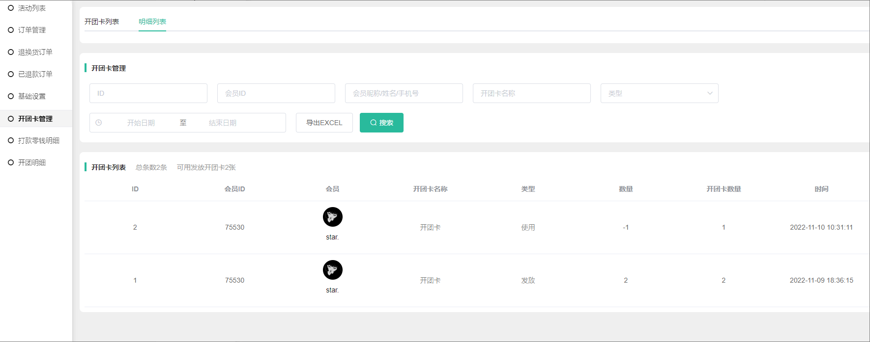 2) 开团卡数量:该开团卡该会员的可使用数量