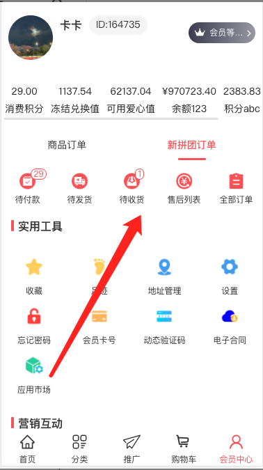 1, 会员中心,营销模块显示新拼团入口,点击进入查看我的拼团